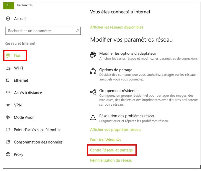 Dans l’onglet Etat, faîtes dérouler la molette de votre souris jusqu’au Centre réseau et partage.
